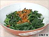 ■ 材料 ・ほうれん草(1わ) ・豆板醤(小さじ2/3) ・練り辛子(小さじ1/2) ・油(大さじ2) ■ 作り方 (1)ほうれん草は塩を加えた熱湯でゆで、冷水にとり水気を絞って4~5cm長さに切り、器に盛ります。 (2)辛子、豆板醤、油を混ぜ合わせて(1)にかけます。