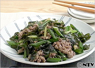 カルシウム豊富な素材、わかめ、わけぎ、ごまの三拍子揃ったヘルシーな炒めものです。