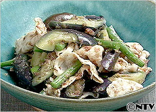 あえる順番は、豚肉、いんげん、なすの順で、削りがつおは最後に加えて、水気を吸わせます。