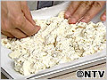 < 覚えておきたい水切りワザ > ペーパーをひいたところに豆腐をくずして広げ、上面にもペーパーをかぶせておき、一度返して、ペーパーを替えると早く水切りできる。