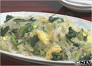 春雨に汁を吸わせながら炒め、水気が少し残ったところでほうれん草を加えます。