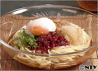 茹で上がっためんは、氷水でしっかり冷やして、水気をギューッと絞って器に盛ります。(汁が薄まらないように)