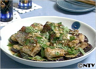 青じそは変色しないようにソースには混ぜないで、かますの上にのせて、ソースをかけます。