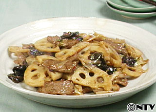 スープを加えたら、ふたをして3分ほど煮、汁気がなくなって、れんこんに火が通ったら牛肉をもどしいれます。