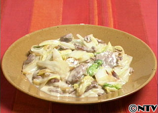 白菜の炒め方がポイント、葉元から、途中ふたをして蒸し焼き状態にしながら火を通し、しんなりしたら葉先を加えてさらにふたをして蒸し焼きにして炒め合わせます。