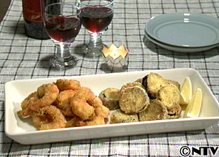 えびを揚げる前に、なすの揚げカスをきれいに取り除きましょう。