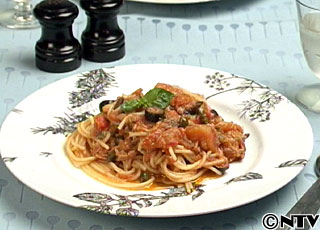 トマトが煮崩れたソースの中にパスタを加えて、気持ち長めにからめます。