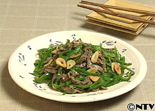 こんがり色づいたら、取り出し、にんにくの香りのでた油でピーマンを炒めます。