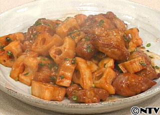 ケチャップあんは鍋に入れて混ぜながら煮立て、ツヤがでてきたら、豚肉とれんこんを戻し入れてあんをからめます。