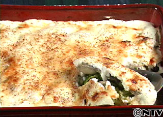 あまり焼き色がつかないグラタンなので、ナツメッグの色がポイントになっています。