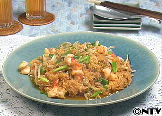 ビーフンに汁を吸わせてねっとりとした状態になるまで炒め、もやしとにらはシャキシャキ感が残るようにさっと炒め合わせます。