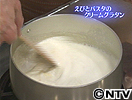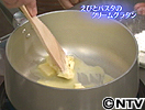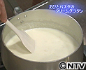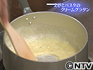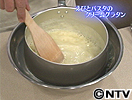 (4) 再度鍋を弱火にかけて温めた牛乳を1/4量加えてとろみがつくまでよく混ぜる。