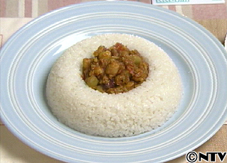 ▼ココナッツライス (1) 米は炊く1時間前にといで、ザルに上げる。 (2) フライパンに油大さじ2を熱し、米を入れて透き通るまで炒め、粗熱をとる。 (3) 炊飯器に(2)を入れ、ココナッツミルク、水、塩、こしょうも加え、ざっと混ぜて炊く。炊き上がったら全体を軽くほぐす。