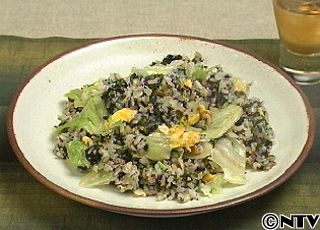 ばら干しのりは長く水に放さないこと、さっと浸してすぐザルに上げて水気をギューっと絞り、炒めやすいように、ハサミで切ってほぐしておきます。