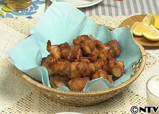 ポイントは2度揚げ・・・まず中温の油に入れ、箸で触ったりしないで、浮き上がってきたら返して全部で4分ほど揚げ、一度取り出し、温度を上げて、2度目は色づくまで揚げます。