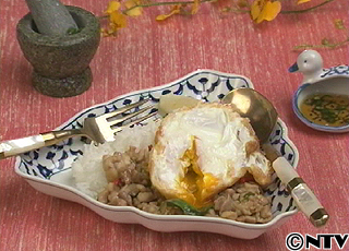 この料理、タイ語で「パット グラッパオ ガイ ラード カオ」、パットは炒める、グラッパオはシソ科のハーブ、ガイは鶏肉、ラード カーオはかけごはんの意味、汁ごとごはんにかけて、フライドエッグとよく混ぜていただきましょう!