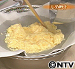 塩を加えた熱湯に卵を流し入れ、ふわっと浮いてきたら、キッチンペーパーを敷いたザルにあけ、水気をきる。 (このとき、四角くなるようにあけるとよい)