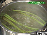 沸騰湯に入れてゆで、細いものから取り出し、しなるようになったら水にとる。