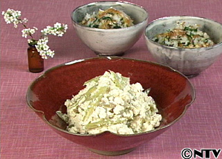 豆腐全体に塩味をなじませてから、ふきをあえます。