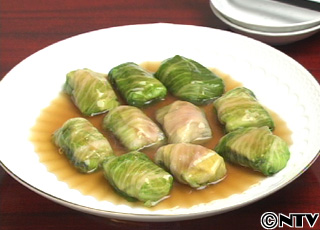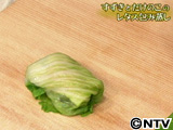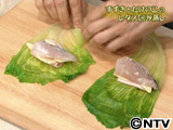 レタスを広げ、中央よりも上めにハム、たけのこ、すずきの順にのせる。