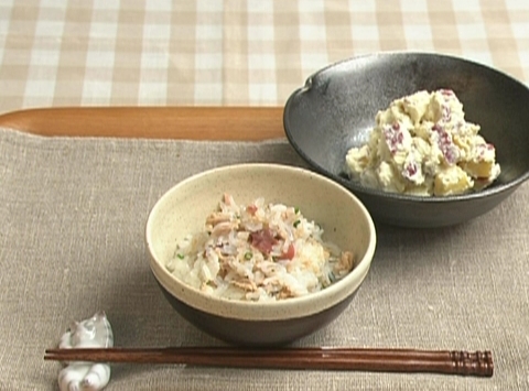 ゆでたしらたきはよく水気を絞っておくこと(余分な水気が残っていると炊き上がりベチャっとしてしまう)。