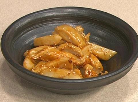 もう一品のきんぴらのれんこんは大ぶりの乱切りにし、強火炒めるのがポイントです。
