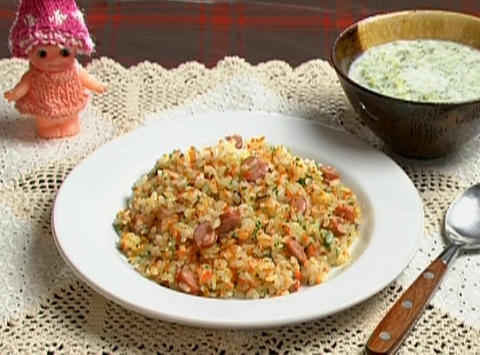全体に油がまわって米が熱くなるまで炒めてから水を加えます。