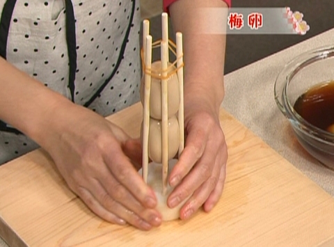 輪切りの大根を台にして菜箸5本を卵の直径よりやや小さめに、等間隔に立てる。その中に卵を縦に入れ、中間と上部を輪ゴムで締めて30 分ほどおく。半分に切ると梅の形になる。