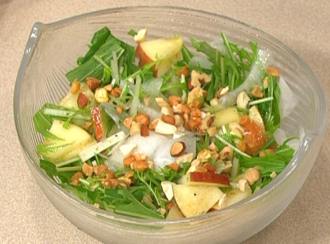 スライスした大根、3~4cm長さに切った水菜、薄切りのりんごにすりおろしオニオンドレッシングをかけ、おつまみ用のナッツを散らす。