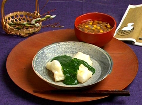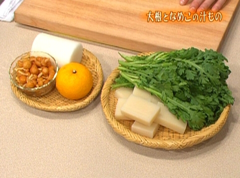 焼きもちの春菊あんかけ 大根となめこの汁もの