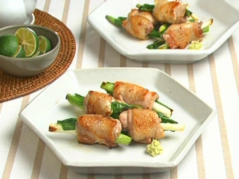 わけぎを短くカットすると巻く量が増えて、肉がはがれやすくなるので、長めに切っておくこと。