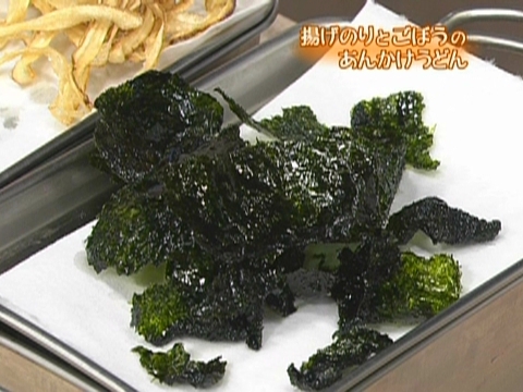 のりの揚げ上がりは、油の音を聞いて判断します(はじめシュワーと、音が消えたら揚げ上がり)。