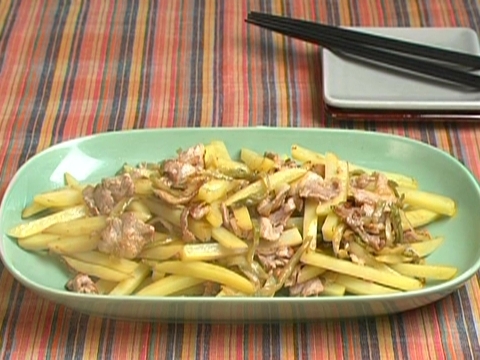 じゃが芋の表面が透き通るまで炒め、必ず味見をし、芋の固さを確認してから肉を加えます。