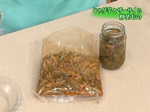 これが‘味つけザーサイ’、瓶入りと袋入りがある。せん切りタイプはすぐ使えるので便利。
