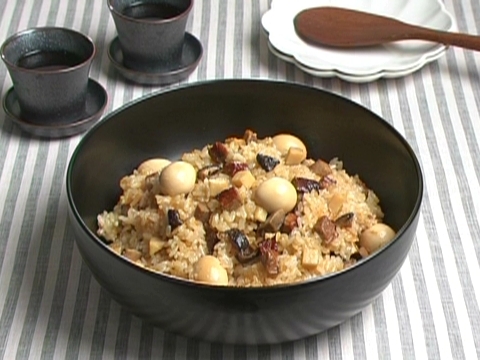 うずら卵は一緒に炊くと、破裂することがあるので、炊き上がってから加えます。