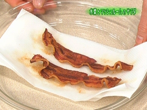ベーコンはペーパータオルにのせて、ラップなしで加熱し、そのまま冷ます。