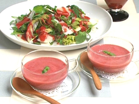 いちごのガスパチョ 帆立、うど、クレソンのサラダ