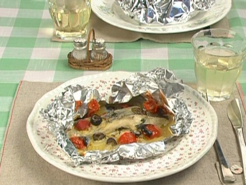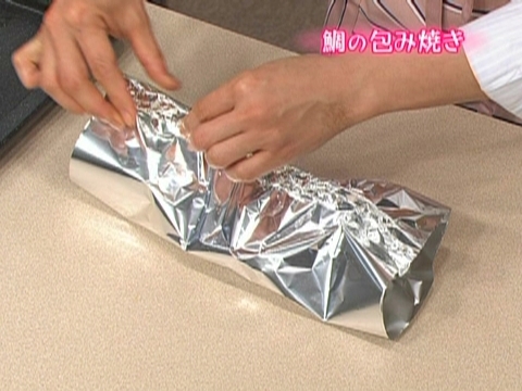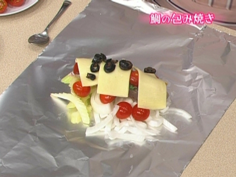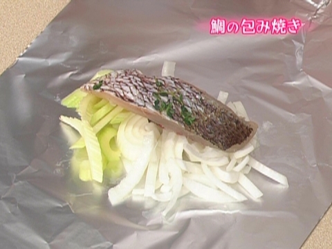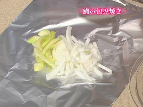 (1) アルミ箔を40cm長さに切っておき、中央にセロリと玉ねぎをのせる。