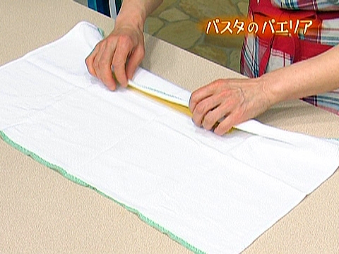 テーブルの角を利用して、上から下へ引っ張るようにして折る。