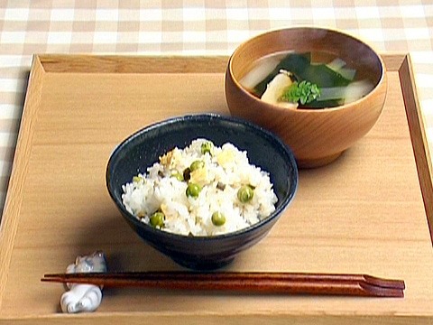 グリンピースは乾燥しないように、炊く直前にさやからはずします。