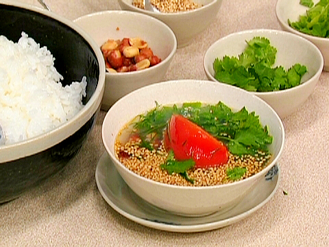 トッピングをいろいろのせてスープをかけて食べる 汁かけごはんもおすすめ! 器にごはんを軽く盛り、炒り白ごま、皮つき揚げピーナッツ、粗く刻んだ青じそと香菜をトッピングし、スープをかける。ベトナムの人は食感のあるものが大好き。トッピングのピーナッツやごまはたっぷりと大さじ1ほどをのせる。