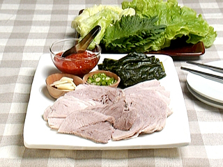 食べるときは、サンチュを大きく広げ、キャベツ、青じそ、わかめなどを重ね、ゆで豚をのせ、たれと薬味野菜を好みに添え、クルッと包んで食べる。