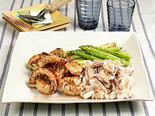 えびを焼くときは、マリネ液の玉ねぎが焦げないように、こそげて焼きます。