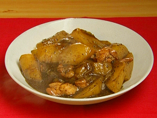 鶏肉と長ねぎは強火で表面に焼き色をつけ(長く炒めると固くなる)、すぐに大根を加え油をなじませます。