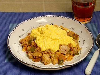 炒り卵は、マヨネーズに牛乳を少しずつ加えてプツプツがなくなるまで溶いておくこと(ブツブツが残っていると焦げやすい)。