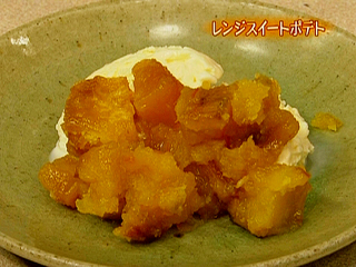 材料:作りやすい分量 焼き芋・・・大1本(400g) バター・・・大さじ2 ママレード・・・大さじ3 ・バニラアイスクリーム 作り方 (1)焼き芋は皮をむき、輪切りにしてボールに入れ、バター、ママレードを加えラップをして電子レンジ強(500w)で5分加熱する。 (2)(1)のラップをはずし、芋をつぶしながら混ぜ、アイスクリームに添える。