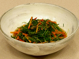 もう一品の煮びたしのポイントは、おかひじきと削りがつおを交互に重ねて煮、決して煮すぎないこと(おかひじきは味が入りにくので全体にいきわたるように)。