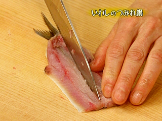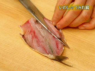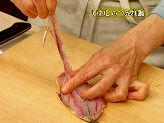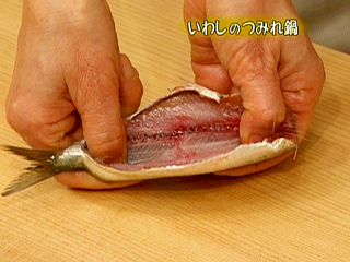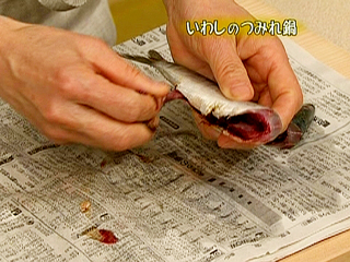 (1)いわしは頭のところをはずし、腹ワタをとり除く。