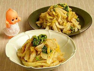 ゆでナムルの白菜は葉元を先に2分ゆでてから葉元を加えてさらに1分ゆでます。