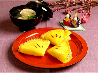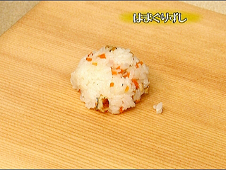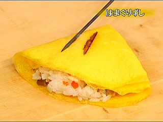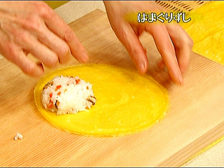 (1)混ぜずしを卵の枚数に合わせて等分にし、平らな三角に握る(このとき一片を薄くしておく)。